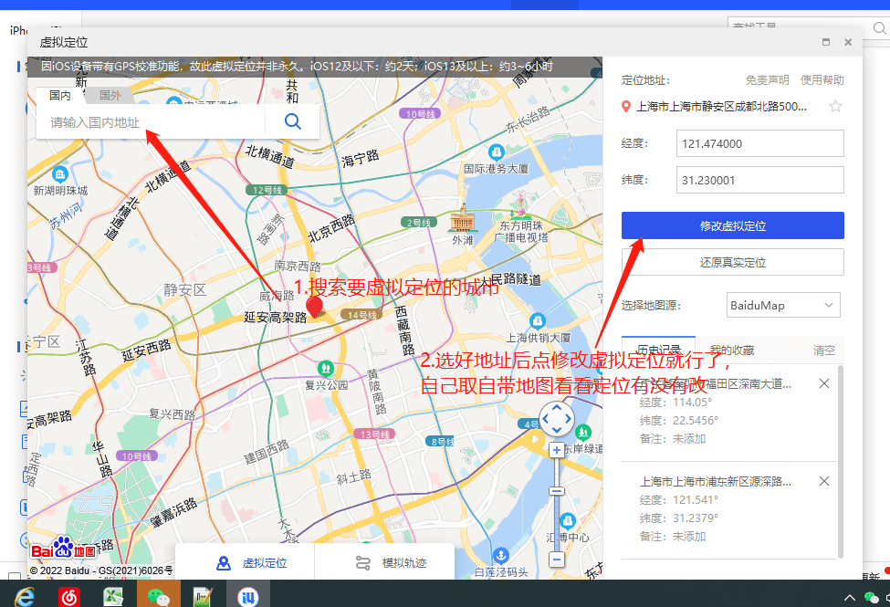 4、左上角搜索要定位到的城市,选择地址 然后点右边修改虚拟定位